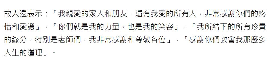 在文中刘珠恩还表示,自己非常感谢一路走来所有帮助过自己,给予过自己力量的家人和朋友,她甚至特意交代希望在自己离开之后,家人朋友不要太过于伤心难受。