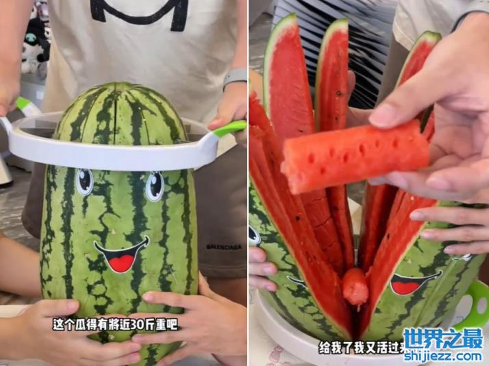 画面中不仅有满桌的高级水果摆在盘子里,甚至还有一个男生正在切将近30斤重的大西瓜,据说是来自新疆的西瓜,切开了之后的确是皮薄肉红,而且男方还非常宠溺的把西瓜中间最甜的部分喂到了慎婕的嘴边上,两人看起来关系相当亲密。