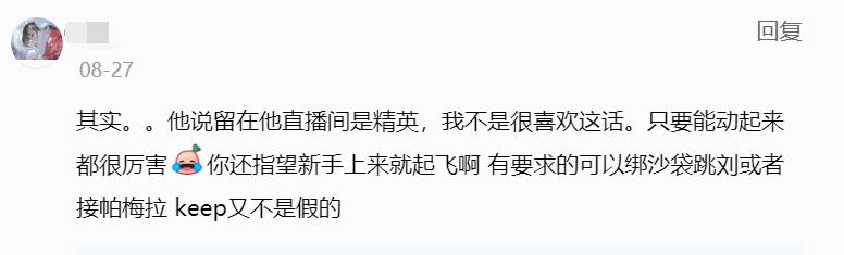 除此之外,有网友表示自己不喜欢辰亦儒的一些言论,比如说他说留在他直播间是精英,这句话就让许多人不赞同,并表示健身直播是让大家可以动起来,毕竟很多都是新手小白。