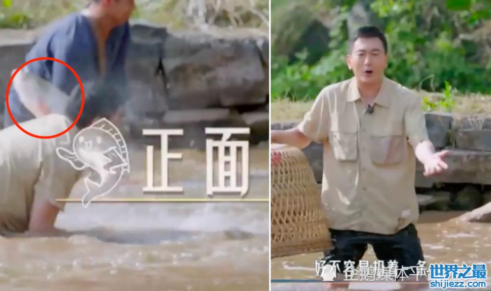 最搞笑的是,鲁健老师还被一条鱼正面“攻击”了。当时他准备去用竹篓圈住这条鱼,没想到它从河水里直接蹦出来,擦了一下鲁健老师的左脸。但是围观的人身体哆嗦吓了一跳,鲁健老师也险些重心不稳跌在河里,最后只能一脸无奈地看着镜头。
