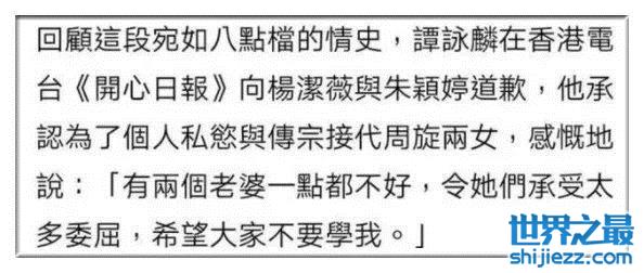 多年后谭咏麟在节目上承认,自己当年为了传宗接代和个人私欲伤害了两位女性,让她们受了多年的委屈,还说同时有两个老婆其实一点也不好。