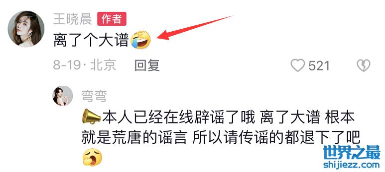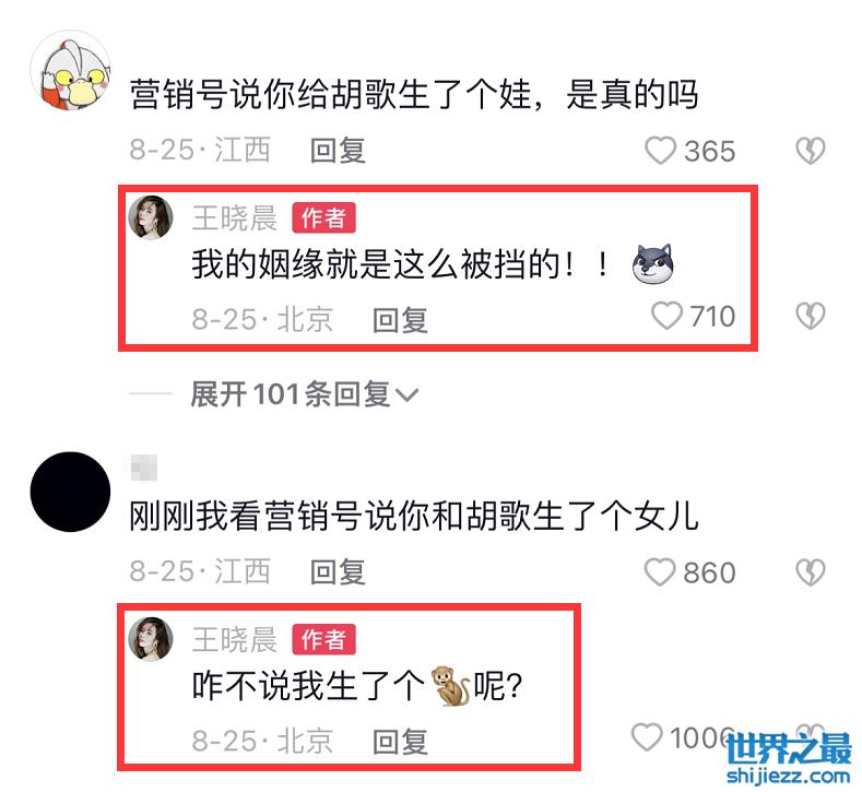 王晓晨辟谣后,依然有网友不相信她,对此王晓晨再次辟谣,这次她直接回复了有关胡歌的留言,表示自己的姻缘就是这么被挡的,关于给胡歌生了个女儿的爆料,王晓晨反问网友“咋不说生了个猴子呢?”