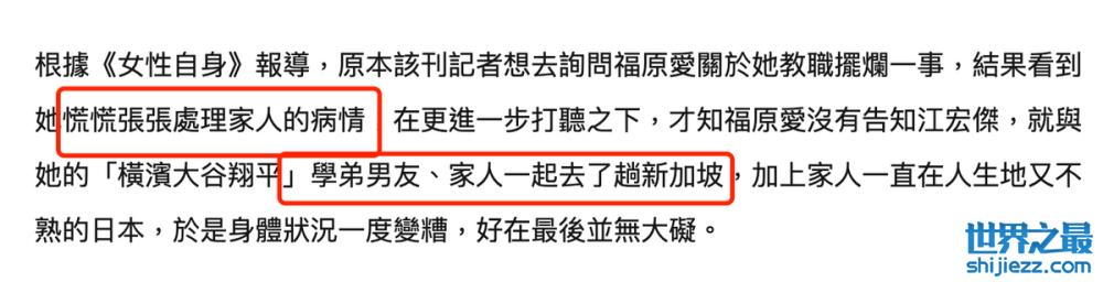 据媒体详细报道,福原爱早前在没有告知江宏杰的情况下,就和横滨学弟男友、家人们去新加坡游玩了几天。或许是水土不服,再加上儿子也才来日本没多久,对陌生环境的紧张感,再加上一些饮食问题,导致身体情况相对变糟糕,但没有什么大问题。