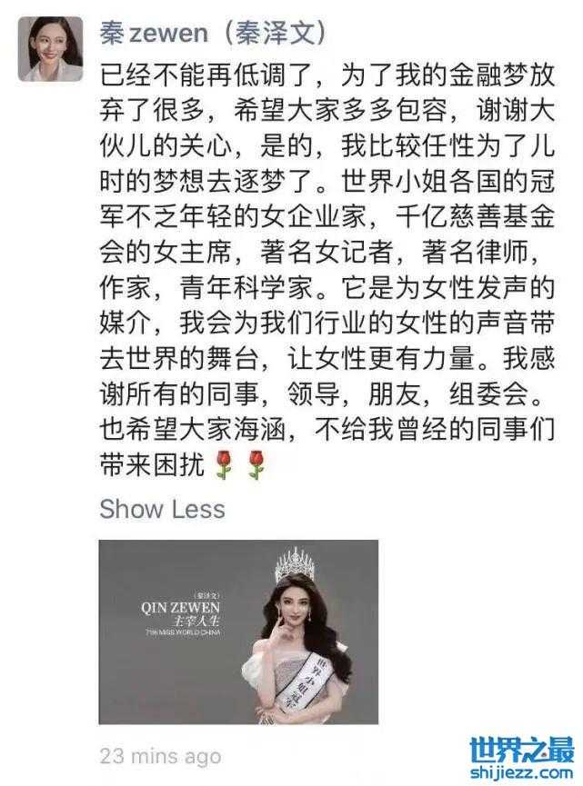 “世界小姐”候选人秦泽文,装不下去了