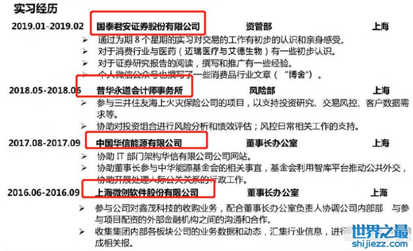 她自称在安信证券、普华永道、甲骨文等知名企业实习过,宣传自己也是打着“金融女神”的旗号。