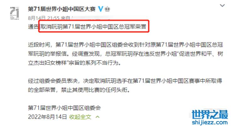 今年中国的总冠军名叫阮玥,但她却被组委会以违反“促进世界和平、树立杰出妇女榜样”宗旨的理由取消了所有荣誉。