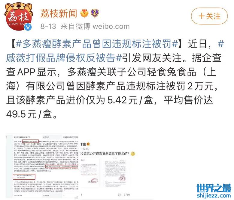 此外,早前“多燕瘦”就曾被爆出因违规标注被罚两万元,报道称该酵素产品的进价仅为5.42元每盒,但平均售价高达49.5元每盒,以9倍多的价格售卖,如此高利润的背后想必很多开支都用来请明星推广宣传了吧。