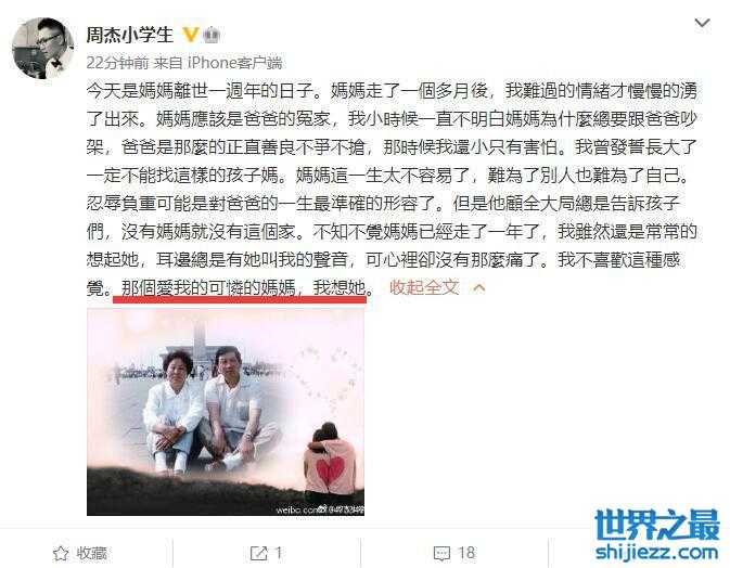 周杰母亲去世一周年,透露妈妈可怜一生不易:我想你了