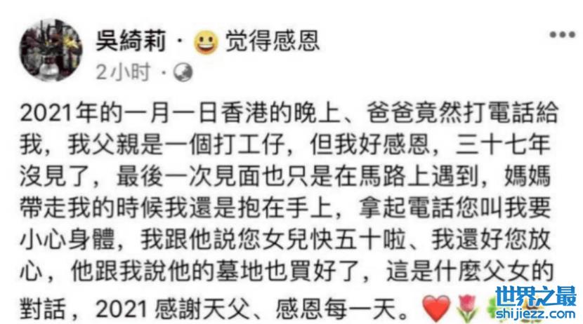 去年初,吴绮莉曾在社交平台上发文称,失联37年的父亲给她打开了电话,让她感到十分意外。文中,她谈到父亲是个打工仔,两人虽然37年没见,但她还是很感恩,拿起电话时父亲让她要小心身体。