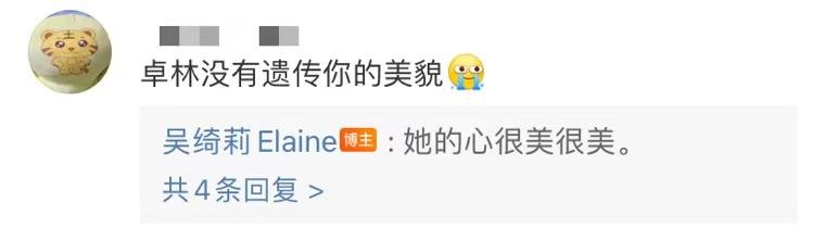 不过,吴绮莉和小龙女的关系可能已经有缓和了,因为有网友在评论区说卓林没有遗传她的美貌,吴绮莉还特地回复并夸了自己女儿,称“她的心很美很美”。