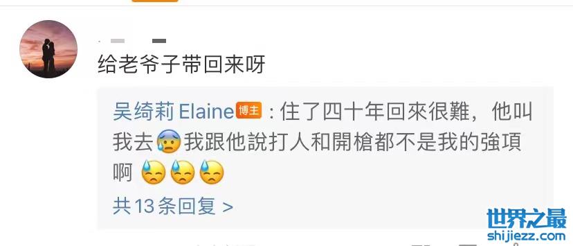 看了吴绮莉的动态,有网友评论道“给老爷子带回来呀”,吴绮莉还回复了对方称“住了四十年回来很难”,而且她的父亲还叫吴绮莉也去美国,吴绮莉则表示打人和K枪都不是她的强项,所以也不敢去美国。不少网友说吴绮莉的回复太幽默了。