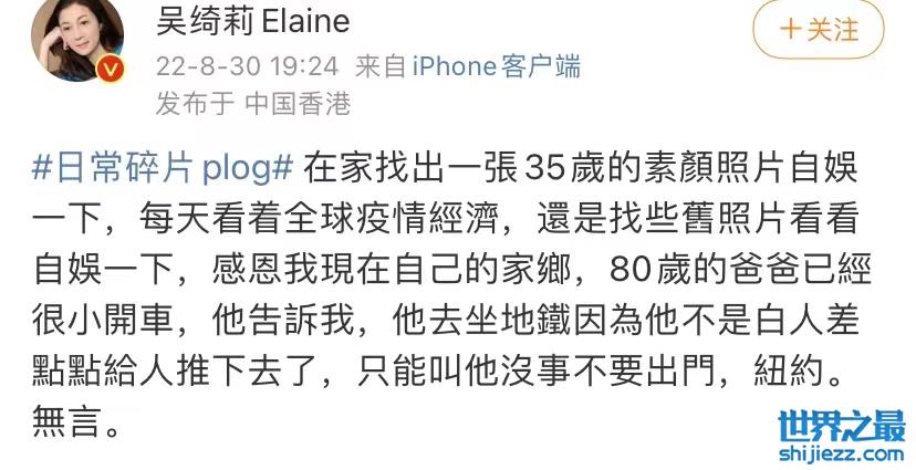她还说每天看着全球疫情经济,还是想找些旧照片看看,转换一下心情。吴绮莉还坦言道“感恩我现在自己的家乡,80岁的爸爸已经很少开车,他告诉我,他去坐地铁因为他不是白人差点点给人推下去了。”她表示自己只能叫爸爸沒事不要出门,还在文末说了句“纽约,无言。”言语中透露出一丝无奈与愤懑。