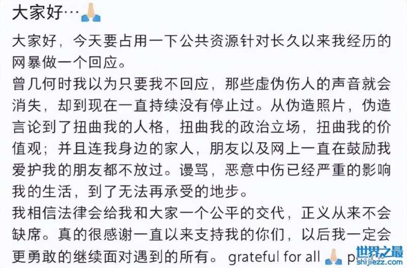 这也是她在此前遭到网络暴力而发律师声明后的新举动,这也足以证明Bella花了很长的一段时间来做调整,恭喜她终于可以开始新生活了。