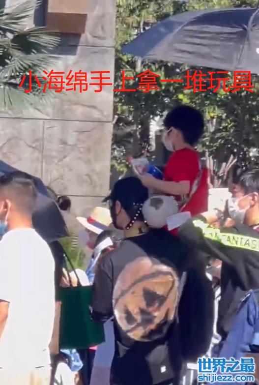 为了不让孩子晒到太阳,黄晓明的身边还有一个助理全程跟随撑伞遮阳,身上还背着一个装着水壶的大包,看起来应该是平时专门照顾小海绵的工作人员。