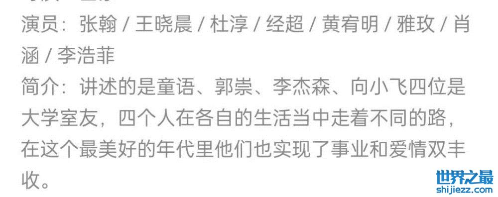 就简介而言,该剧主要围绕童语、郭崇、李杰森、向小飞展开,他们是大学室友,毕业后一直在一起,收获友情和爱情的故事。虽然看起来感觉还不错,事实却并非如此,这剧槽点太多了。
