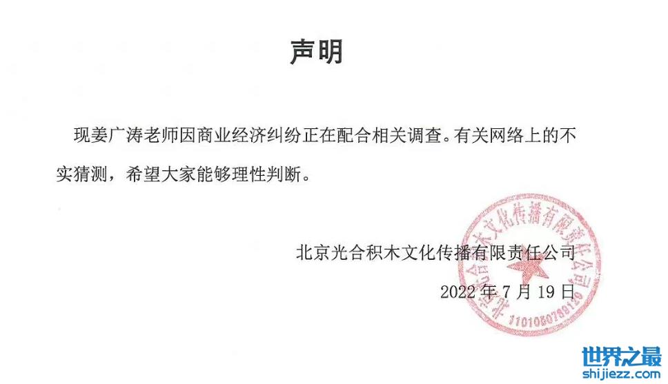 针对外界舆论,7月19日当天,光合积木公司便正式发布声明,声称姜广涛因为商业经济纠纷正在配合相关调查,有关网络上的各种不实猜测,希望大家可以理性判断。