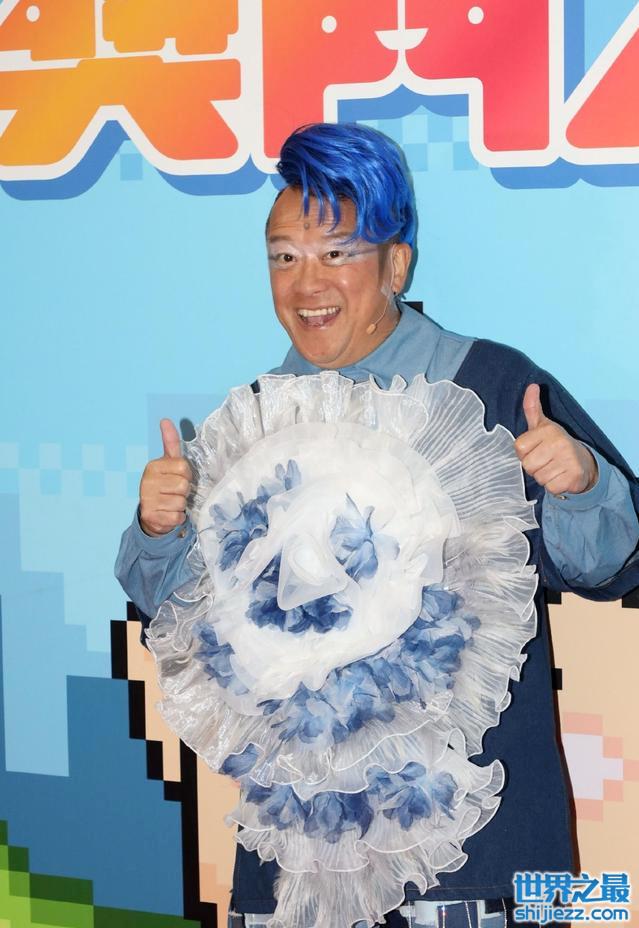 当天,亮相节目现场的曾志伟造型颇为夸张怪异,发色是相当乍眼的亮蓝色,此外,为了配合新造型,曾志伟还涂抹了闪亮亮的眼影,其服装更是特立独行,胸前还带着一大束蓝白相间的布艺花束。