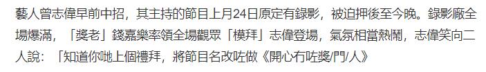 在节目录制中,钱嘉乐还带领全场观众膜拜曾志伟登场,气氛相当热闹,曾志伟还笑着说,知道你们上个礼拜将节目改叫《开心没有奖门人》。