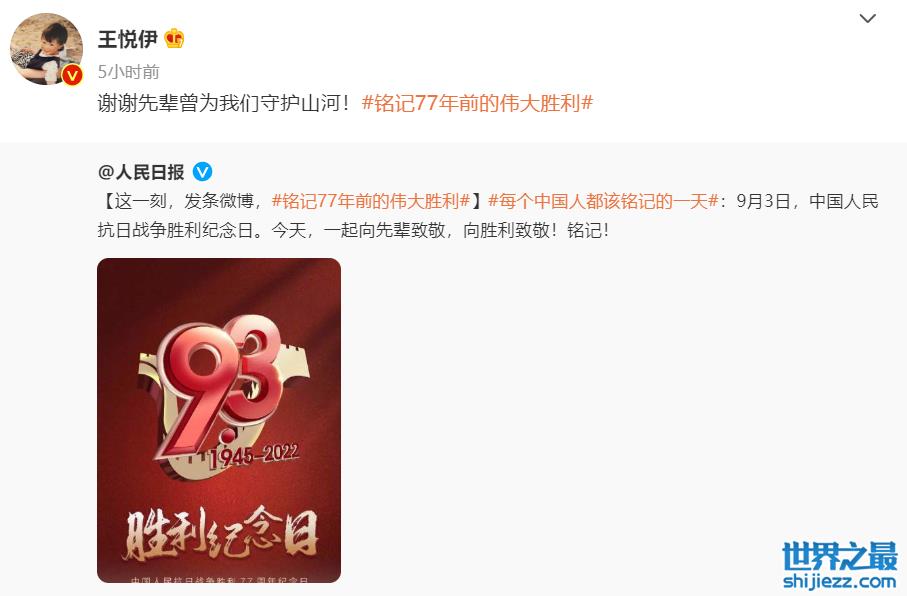 9月3日,是中国抗日战争77周年纪念日,人民日报发布了庆祝77年前伟大胜利的官方动态,而后很多明星相继予以转发,其中包括此前发布不当言论的女艺人王悦伊。