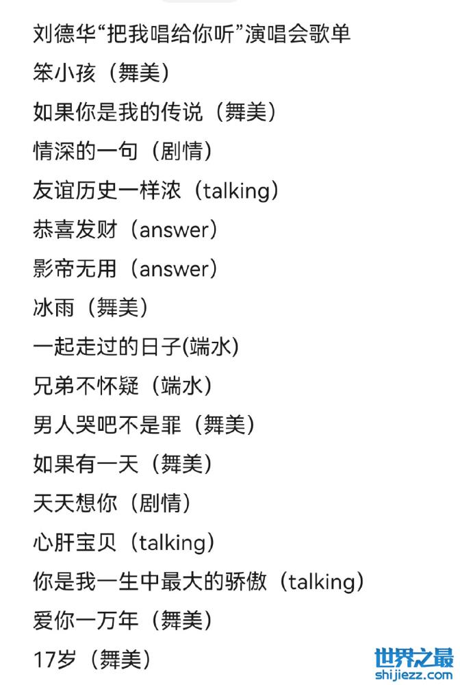 据统计,刘德华线上演唱会一共演唱了16首歌,其中包括大家非常熟悉的经典歌曲《笨小孩》《恭喜发财》《冰雨》《男人哭吧不是罪》《爱你一万年》等,刘德华也演唱了第一首作词歌曲《如果你是我的传说》,另外,有几首歌曲并非是刘德华提前准备好要演唱的歌曲,而是为了满足粉丝的要求而临时加的歌曲,真就是福利满满,诚意满满,非常宠粉了。
