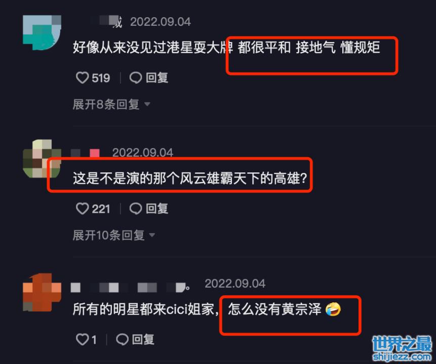 对此,很多网友表示每次来参加Cici姐家宴的港星们,从来没有见过耍大牌的,都非常平和,而且很懂礼貌规矩;还有人暗示Cici姐姐,希望下次她能请到黄宗泽等帅气有型的男明星。
