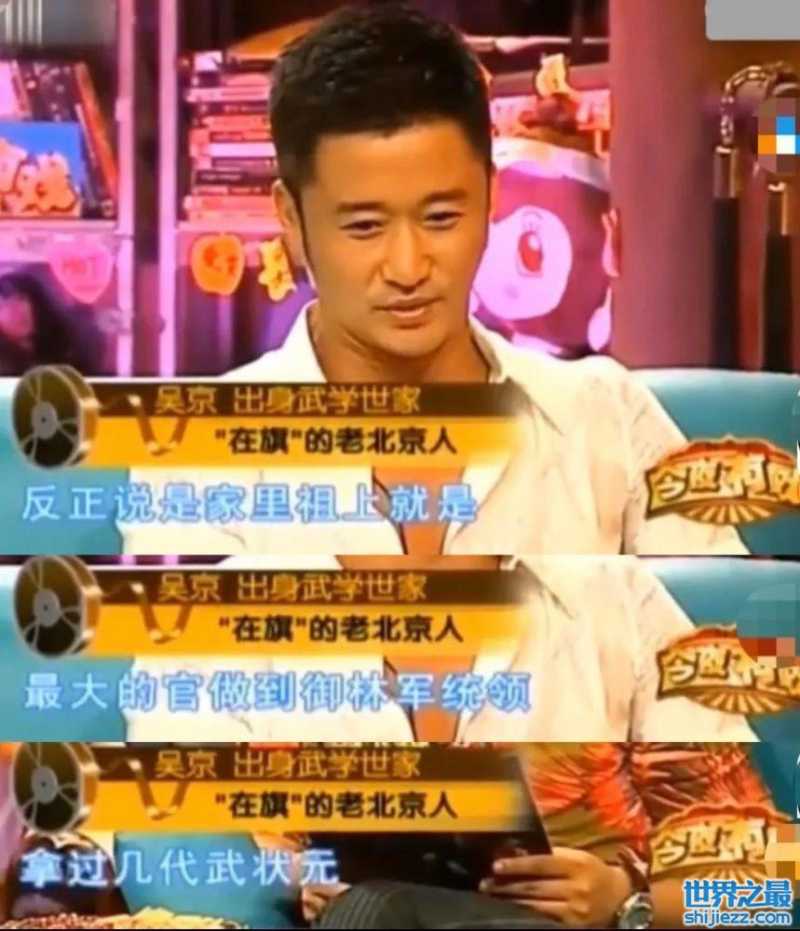 吴京也是满族正白旗人,他的满族姓氏是乌拉那拉氏,后来在雍正年间,被赐姓为“乌雅氏”,所以吴京真正的名字应该是乌雅京。据他说,他们家是多尔衮的后裔,祖上是武术世家,家里最大的官是御林军统领,除此之外,他们家还有几位武状元。