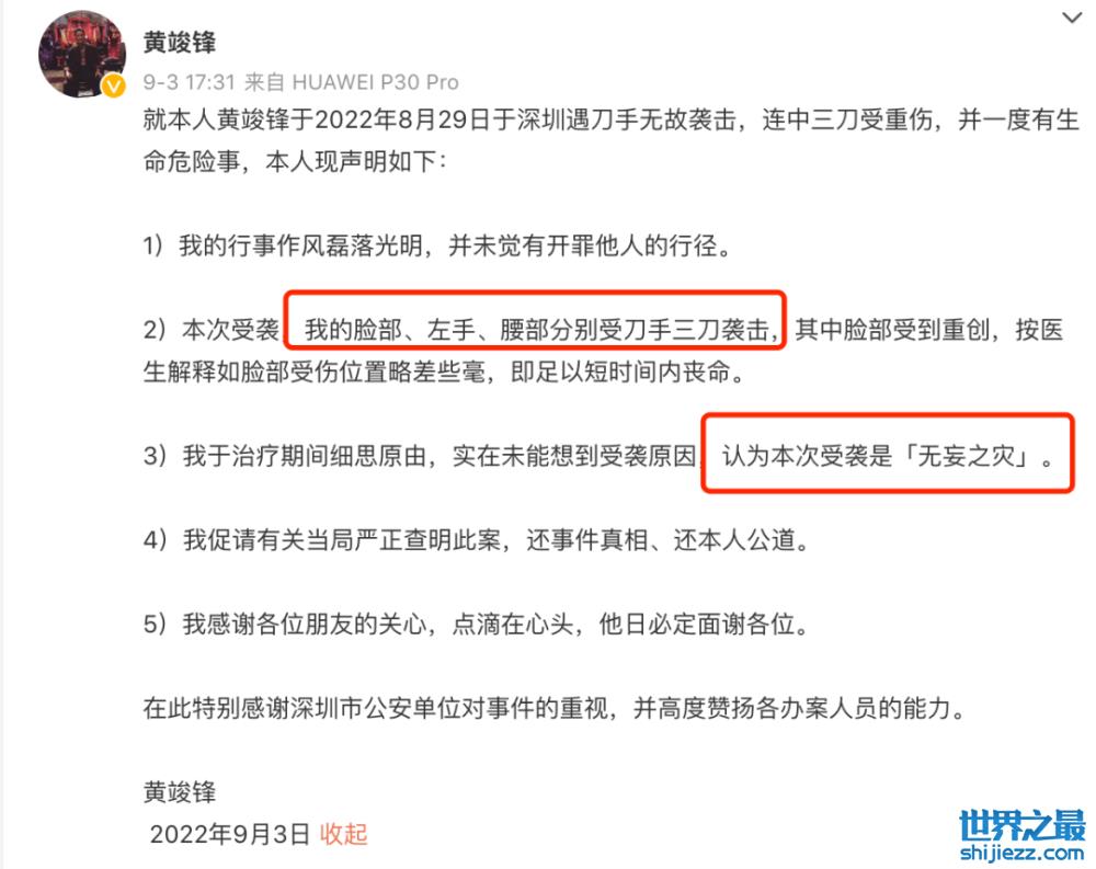 9月3号,黄竣锋治疗后发表声明,表示自己思来想去都找不出对家,表示自己这次受袭是无妄之灾。