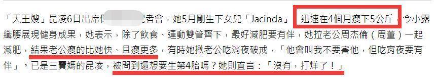 9月6日,昆凌出席记者会,身穿白色西装,露出小蛮腰,昆凌在5月份刚生下三胎女儿“Jacinda”,四个月的时间瘦下10斤。昆凌还自曝除了饮食瘦身之外,还有运动,每天拉着周董一起健身,最后周董比昆凌瘦得还快,