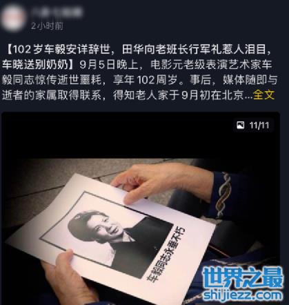 之前曾有媒体透露,车毅于9月初去世,享年102岁,当时老人还在睡梦中,是十分安详地辞世。而鉴于疫情特殊时期,车毅的身后事一切安排从简,膝下儿孙辈、重孙辈都纷纷赶来送别最后一程。