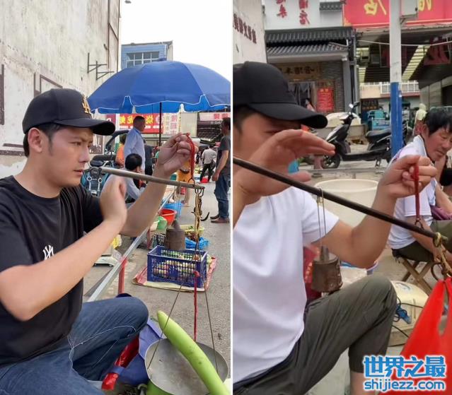 然后他就拉着满筐的菜,去乡里集市贩卖。搭马扎、摆好蔬菜,本以为他是个花架子,但他手法熟练又专业,甚至还会看秤!他在集市一坐就是半天,直到菜卖完。