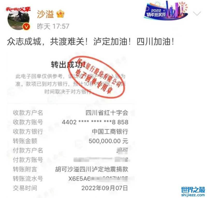 一直以来,沙溢胡可夫妇低调认真,深受大家的喜欢,这次地震,他们也为泸定捐款50万元。