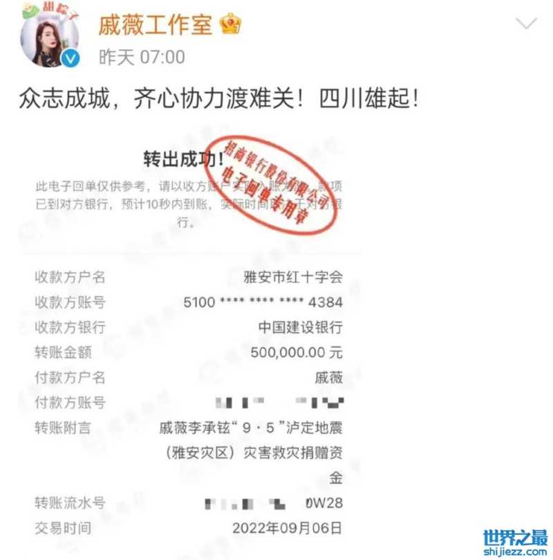 另一方面,李承铉戚薇夫妇,一起为四川捐款50万元,戚薇还用四川话加油打气,鼓励大家雄起。