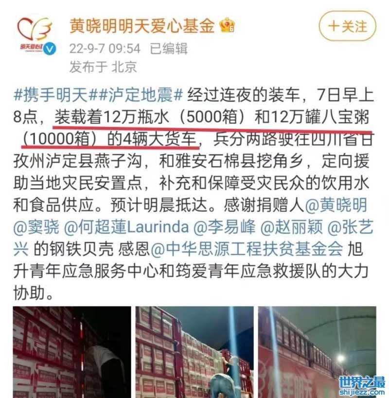 事实上,这并不是黄晓明第一次向泸定捐物资了,此前,他就与李易峰、赵丽颖、张艺兴等明星一起,向泸定捐了12万瓶水和12万罐八宝粥。
