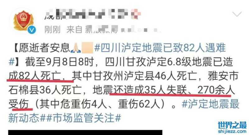 9月5日,四川省甘孜州泸定县发生6.8级地震,截至目前,已经造成82人死亡,35人失联,270余人受伤。