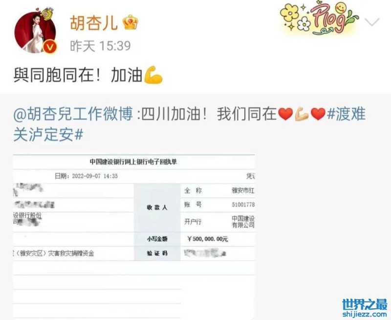 同样捐款50万的,还有胡杏儿。她说,“与同胞同在,加油”。杏儿真是人美心善,难怪那么招人喜欢。