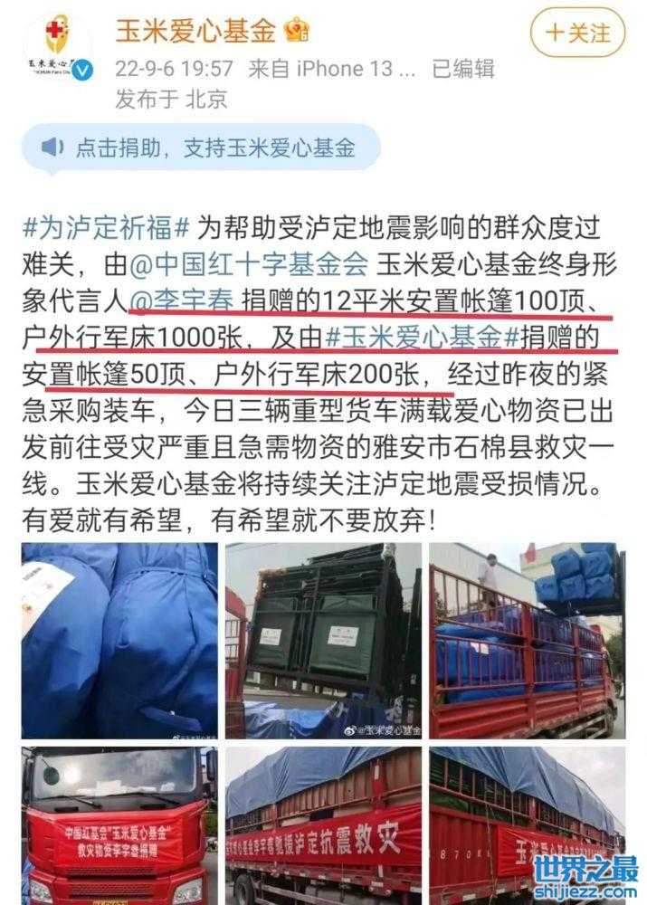 此外,李宇春为泸定捐了很多物资,包括12平米安置帐篷100顶,户外行军床1000张等等。