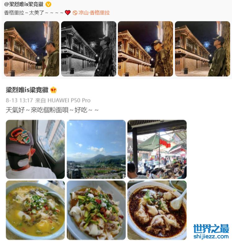 梁竞徽这些年来经常在社交平台晒出内地好吃的好玩的,犹如一个探店博主。八月中旬,他在香格里拉游玩,发出自己帅照并配文“香格里拉太美了”,还在凉山晒出了丰富的四川美食,他这一路走走玩玩,在许多地方留下了足迹。