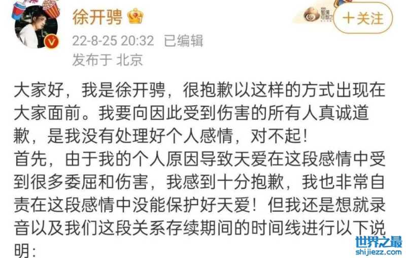 在张天爱古力娜扎都发文后,徐开骋也回应了,他发长文向二人道歉,还解释了与张天爱恋爱的经过。从那之后,直到现在,徐开骋的社交账号就再也没有更新过动态。