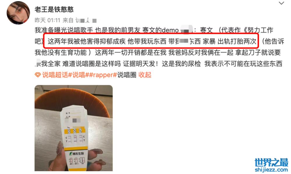 近日,有网友“老王是铁憨憨”发文爆料自己被说唱歌手赛文家暴、带其涉毒、为其堕胎两次等信息,并曝光多张受伤的图片、聊天记录以及录音来实锤,引起网友的热议。