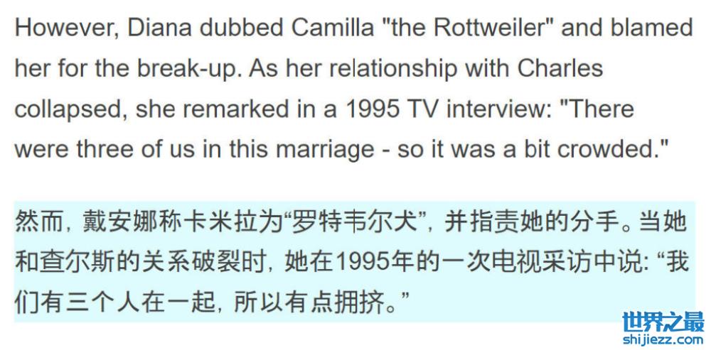 1992年,在著名人物传记《戴安娜:她的真实故事》中,戴安娜指责卡米拉是破坏自己婚姻的第三者,并且戴安娜将卡米拉称作“罗威纳犬”,这是一种身体强壮,气势强悍的德国犬,它性格沉稳,很适合做家庭伴侣犬。