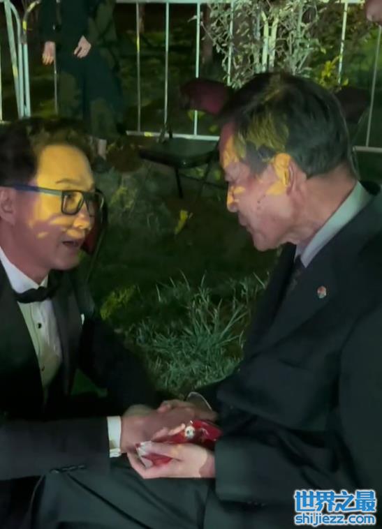 李雪健老师在患癌之后,不仅声带受损,甚至连听力也受到了不小的影响,在嘈杂的环境中用正常音量说话,李雪健不一定能够听清,所以为了能让李雪健可以听的轻松些,他全程把嘴巴贴在李雪健耳边说话,动作十分细心且有教养。
