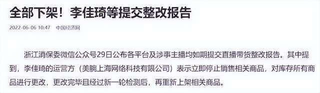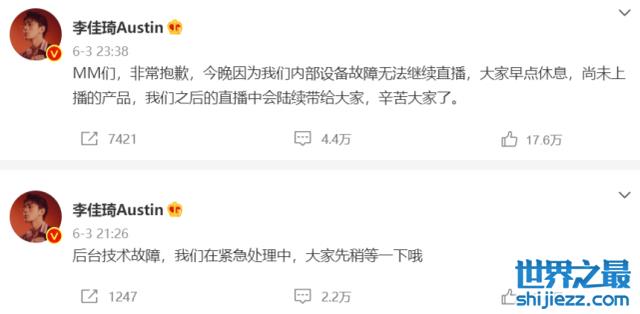 据悉,6月3日之后,李佳琦便自此在直播间消失,就连3号当天的直播也被临时取消,当时李佳琦团队给出的解释是后台出现技术故障,随后李佳琦发布动态透露后台设备暂时无法修复,烦请大家见谅。