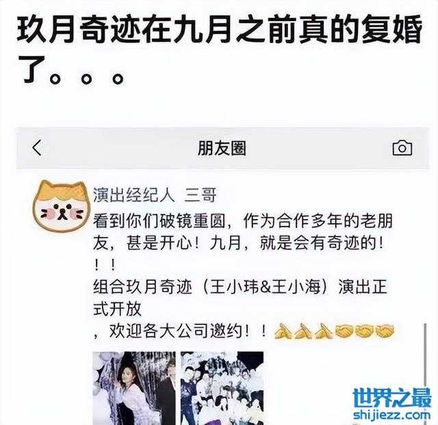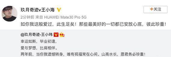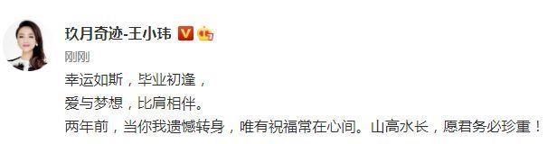 两年前的10月4日,玖月奇迹王小玮在社交平台发文称和王小海已在两年前离婚了,“幸运如斯,毕业初逢,爱与梦想,比肩相伴。两年前,当你我遗憾转身,唯有祝福常在心间。山高水长,愿君务必珍重”。