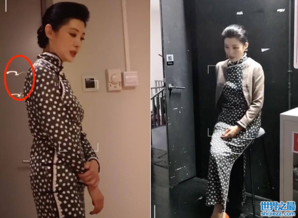 在周涛走动的过程中,可以看到她穿着的旗袍背后有几个固定形状的工具,但又不像电话线之类的东西,可能是舞台表演需要,看起来十分特别。周涛还在后台拍了一些写真,她坐在高脚椅上眼神坚定,高开衩的旗袍设计凸显修长身材,翘着二郎腿气场强大。