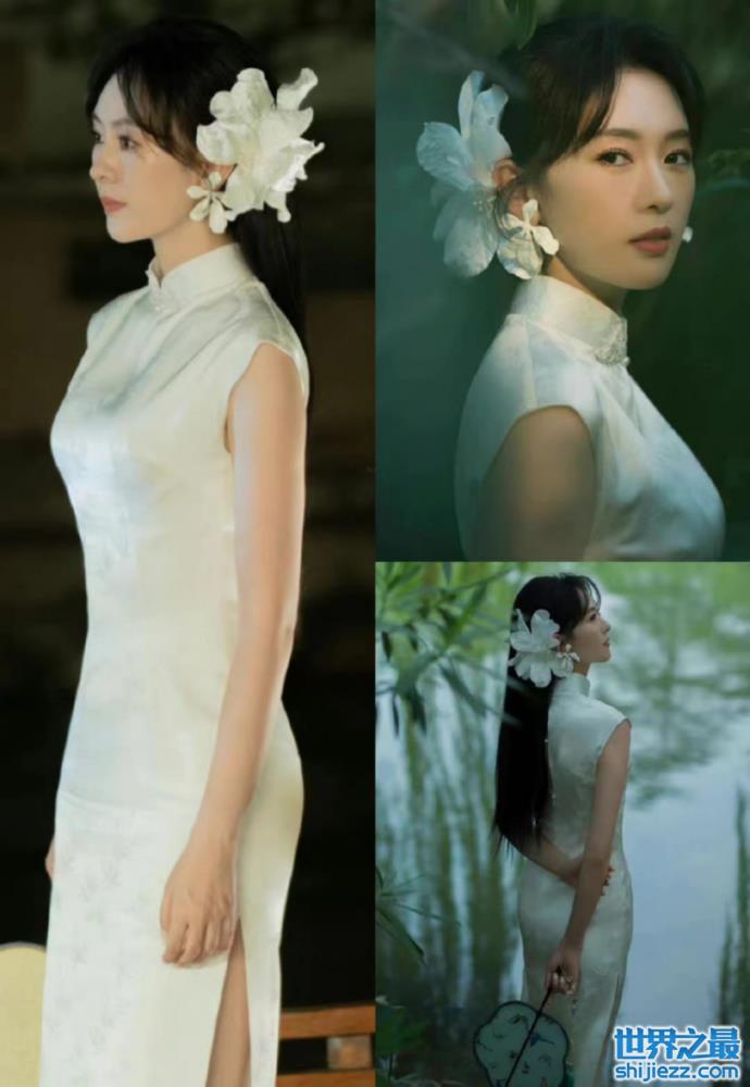 童瑶这次穿了一袭白色旗袍,蝴蝶团扇与花朵装饰交相呼应,淡雅中透着娇俏。