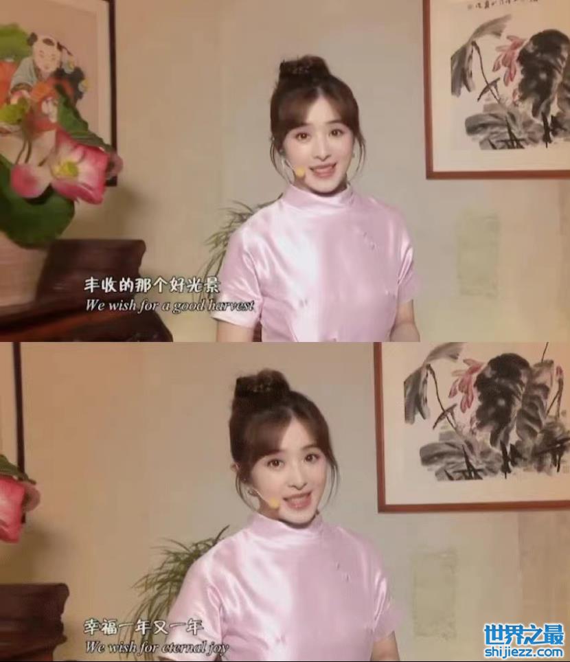 她选择了一袭国风粉红色连衣裙,在月光下看着颇有光泽感,但就是这件裙子领口太高了,显得她脖子有点短。