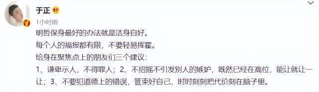 另外,哪里有热闹,哪里就少不了于正,在11日于正也发文,表示明哲保身的最好办法就是洁身自好,并提出三点建议,重点是最后一点,不要犯错道德上的错误,管束好自己,在评论区,于正又澄清说不是针对某件事某个人,还强调任何事没有定论前不要妄加揣测,但他的善意提醒适用所有行业所有人。