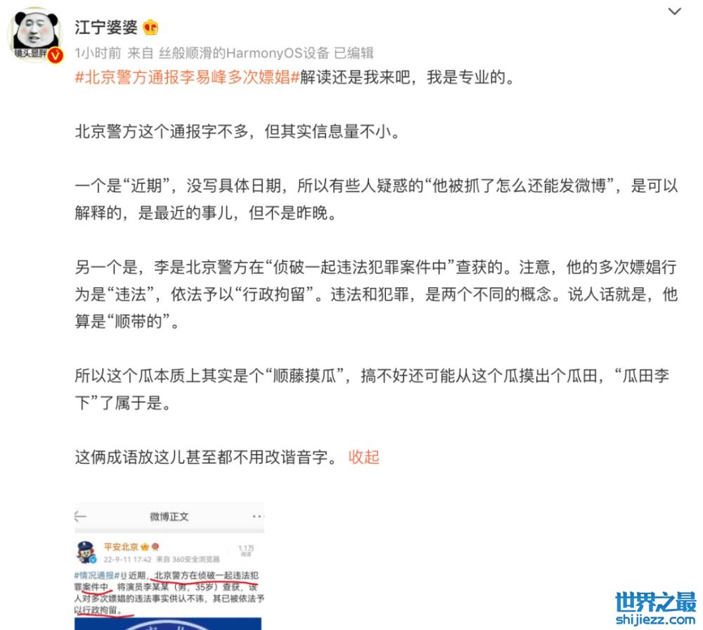 根据博主江宁婆婆的解释,李易峰是在某一起案件的调查过程中,经过侦查发现了犯罪行为。而且不是单次,是多次嫖娼。