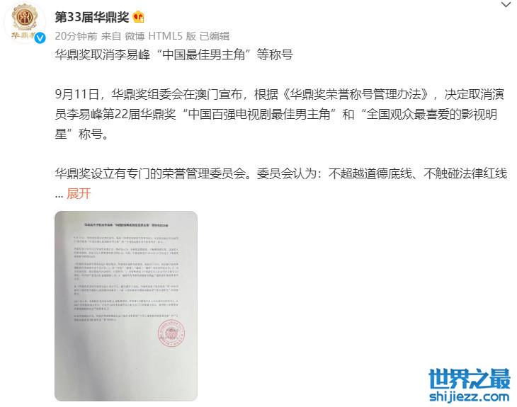 另外,李易峰金鹰奖获奖官宣动态与华鼎奖获奖官宣动态已经全部删除,目前华鼎奖也取消了李易峰最佳男主角与最喜爱的影视明星的称呼。