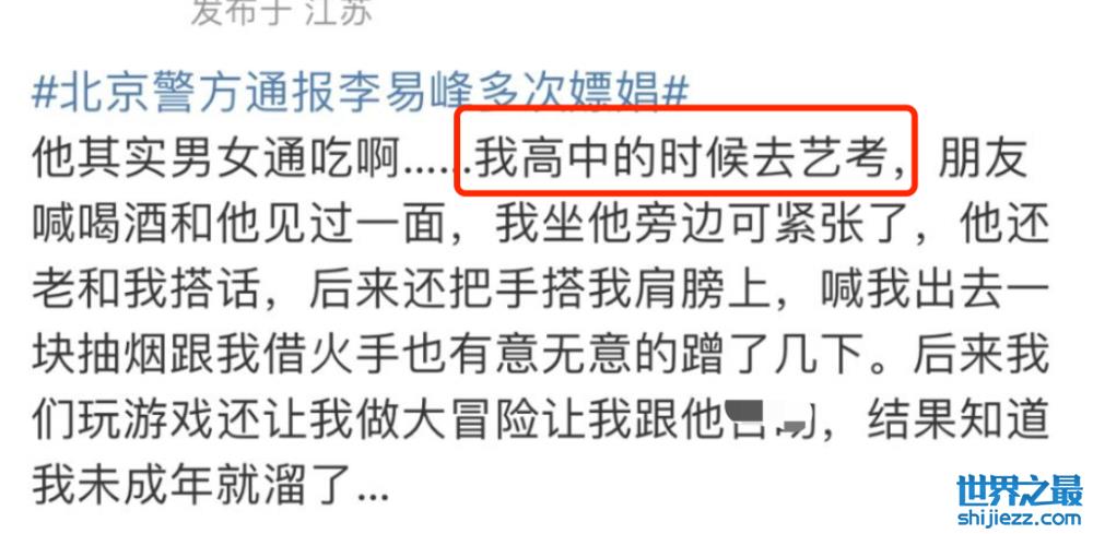 另外还有男生爆料,自己高中的时候艺考,跟李易峰喝过酒,过程中李易峰对他动手动脚,造成了骚扰。后来李易峰知道男生是未成年,于是就走了。